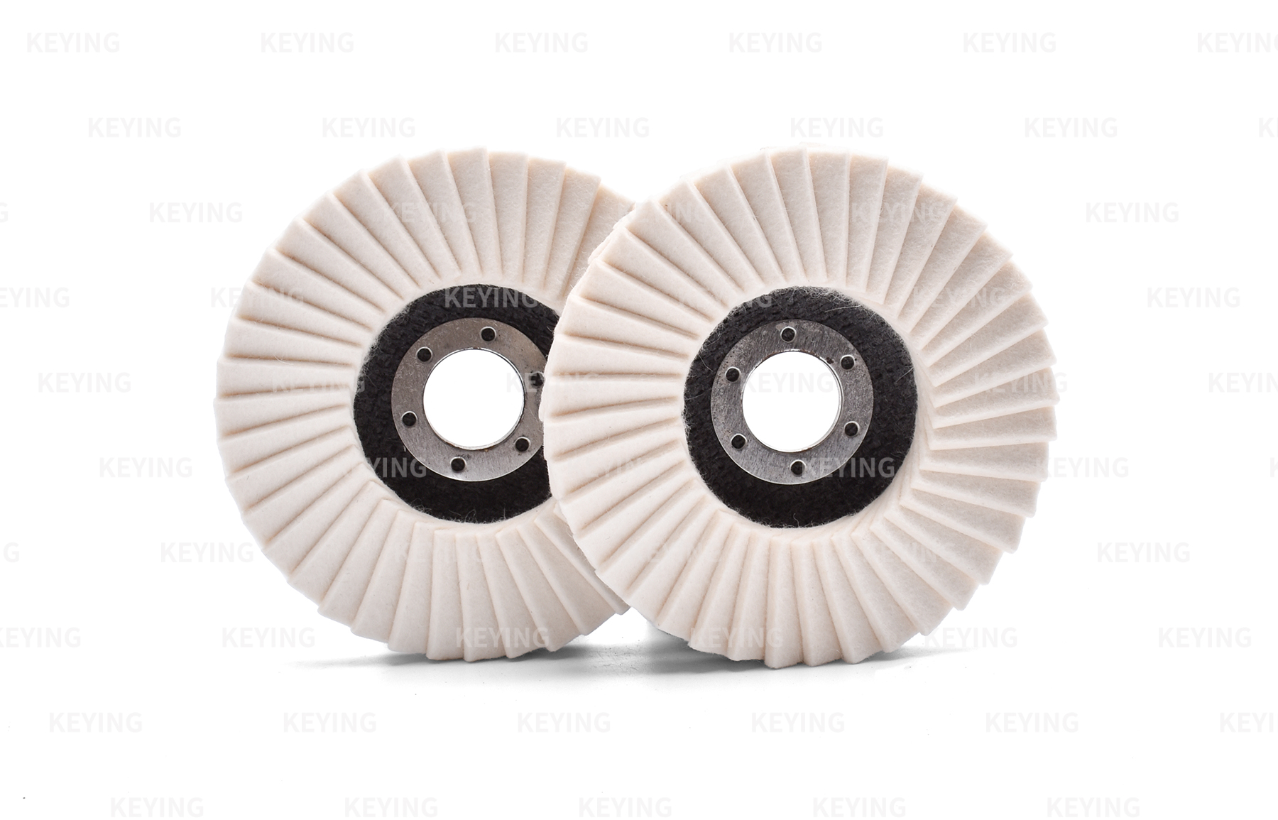 KEYING Wool Flap Disc is made of natural felt and chipped on a fiberglass back. The flexibility of the blades allows cool air to flow at all times and allows the profile of the workpiece to be perfectly adapted. The tool is used with polishing paste for pre-polishing and high-gloss finishes of medium to large components. Therefore, these creams are selected to determine the desired degree of polish.